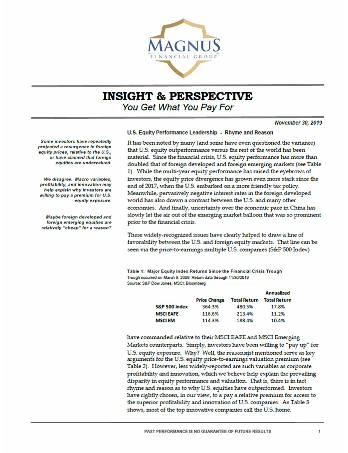 Schwab is a registered broker-dealer, and is not affiliated with Magnus Financial Group or any advisor(s) whose name(s) appears on this Website. Magnus Financial Group is/are independently owned and operated. Schwab neither endorses nor recommends Magnus Financial Group. Regardless of any referral or recommendation, Schwab does not endorse or recommend the investment strategy of any advisor. Schwab has agreements with Magnus Financial Group under which Schwab provides Magnus Financial Group with services related to your account. Schwab does not review the Magnus Financial Group Website(s), and makes no representation regarding the content of the Website(s). The information contained in the Magnus Financial Group Website should not be considered to be either a recommendation by Schwab or a solicitation of any offer to purchase or sell any securities.