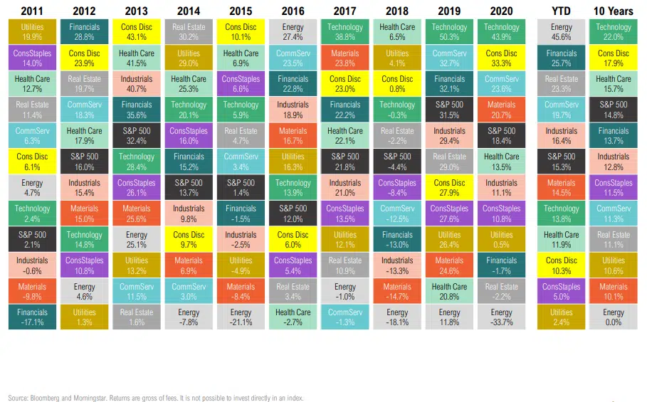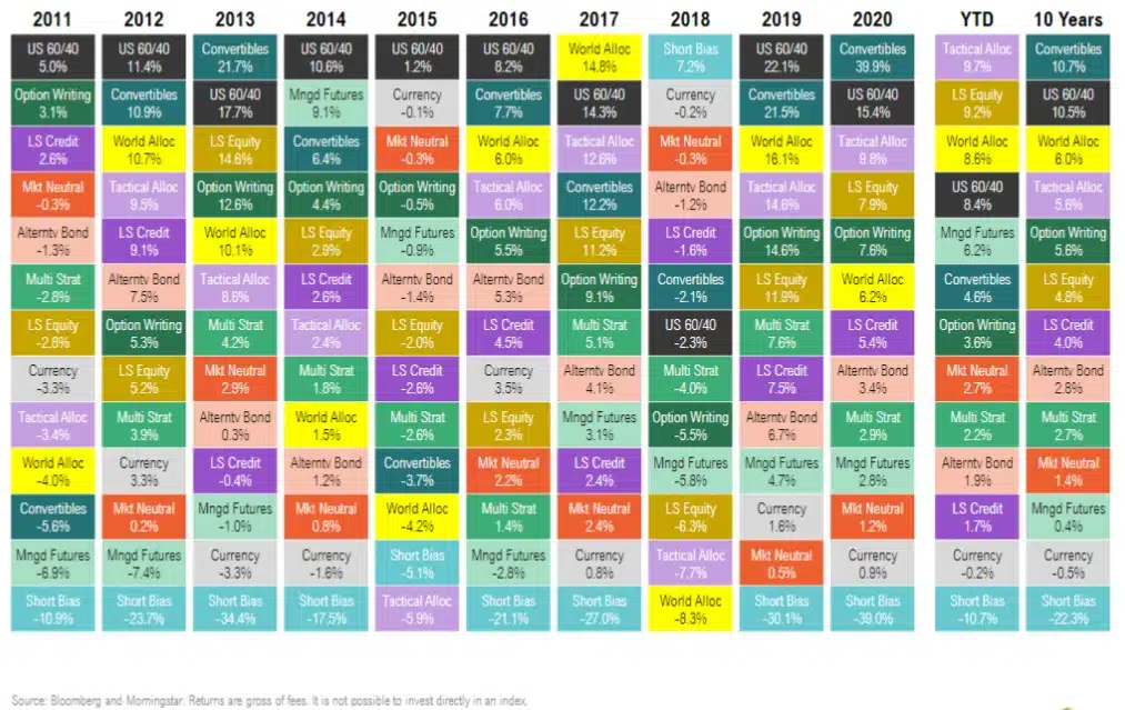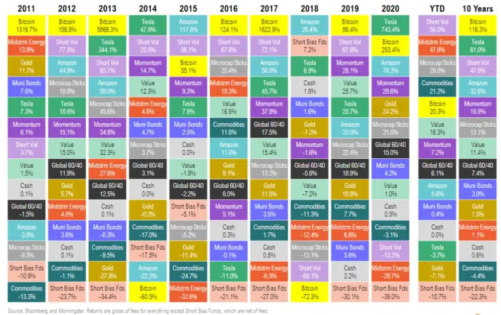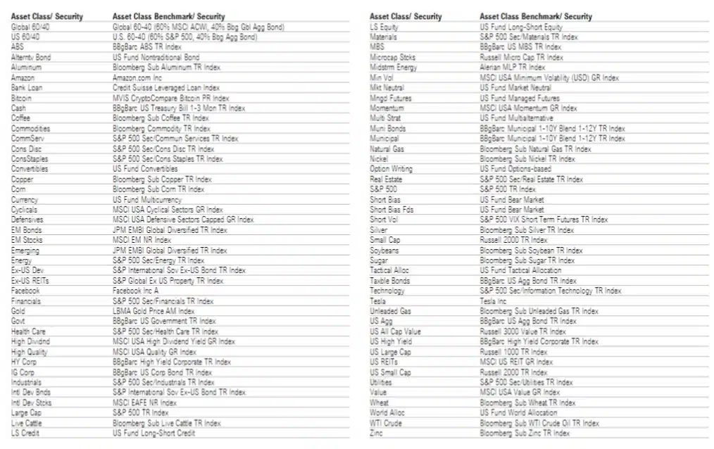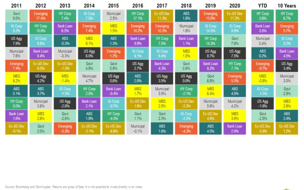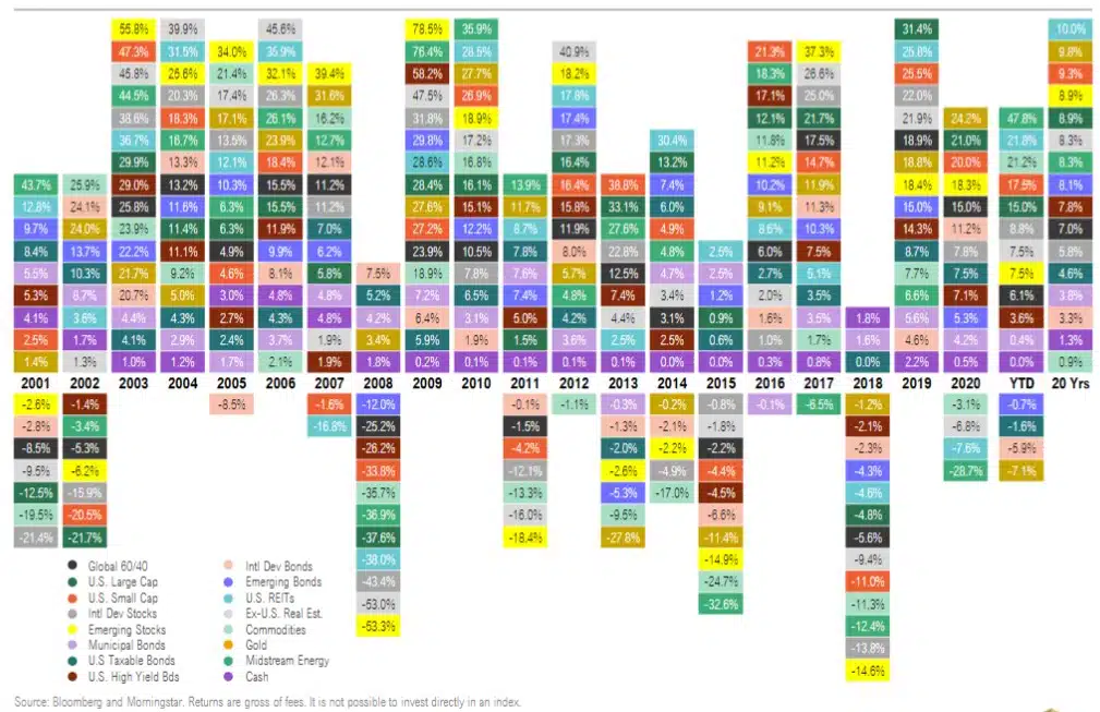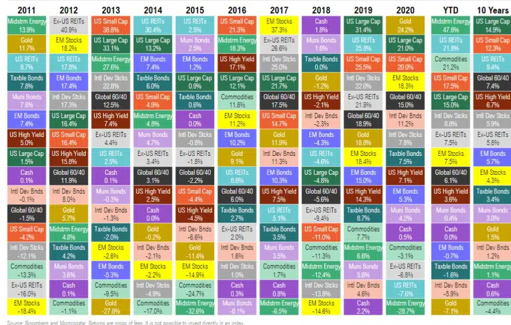Asset class performance was measured using the following benchmarks: U.S. Large Cap Stocks: S&P 500 TR Index; U.S. Small & Micro Cap: Russell 2000 TR Index; Intl Dev Large Cap Stocks: MSCI EAFE GR Index; Emerging & Frontier Market Stocks: MSCI Emerging Markets GR Index; U.S. Intermediate-Term Muni Bonds: Bloomberg Barclays 1-10 (1-12 Yr) Muni Bond TR Index; U.S. Intermediate-Term Bonds: Bloomberg Barclays U.S. Aggregate Bond TR Index; U.S. High Yield Bonds: Bloomberg Barclays U.S. Corporate High Yield TR Index; U.S. Bank Loans: S&P/LSTA U.S. Leveraged Loan Index; Intl Developed Bonds: Bloomberg Barclays Global Aggregate ex-U.S. Index; Emerging & Frontier Market Bonds: JPMorgan EMBI Global Diversified TR Index; U.S. REITs: MSCI U.S. REIT GR Index, Ex U.S. Real Estate Securities: S&P Global Ex-U.S. Property TR Index; Commodity Futures: Bloomberg Commodity TR Index; Midstream Energy: Alerian MLP TR Index; Gold: LBMA Gold Price, U.S. 60/40: 60% S&P 500 TR Index; 40% Bloomberg Barclays U.S. Aggregate Bond TR Index; Global 60/40: 60% MSCI ACWI GR Index; 40% Bloomberg Barclays Global Aggregate Bond TR Index.