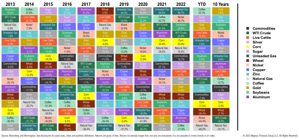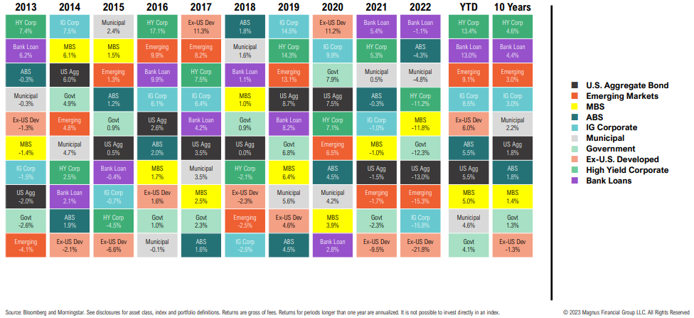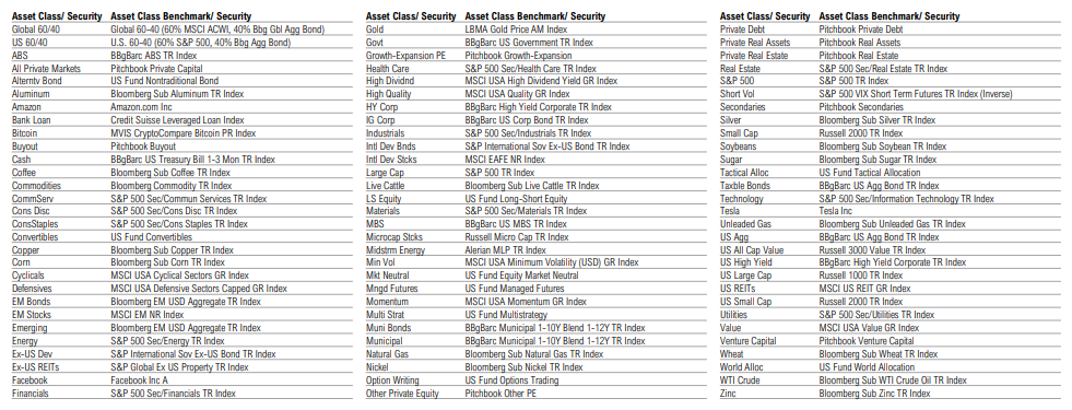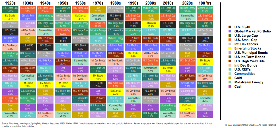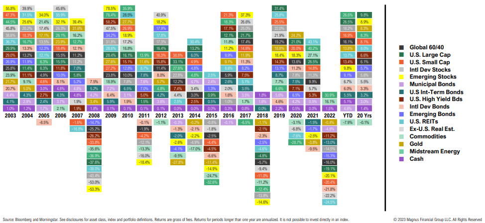 Asset class performance was measured using the following benchmarks: U.S. Large Cap Stocks: S&P 500 TR Index; U.S. Small & Micro Cap: Russell 2000 TR Index; Intl Dev Large Cap Stocks: MSCI EAFE GR Index; Emerging & Frontier Market Stocks: MSCI Emerging Markets GR Index; U.S. Intermediate-Term Muni Bonds: Bloomberg Barclays 1-10 (1-12 Yr) Muni Bond TR Index; U.S. Intermediate-Term Bonds: Bloomberg Barclays U.S. Aggregate Bond TR Index; U.S. High Yield Bonds: Bloomberg Barclays U.S. Corporate High Yield TR Index; U.S. Bank Loans: S&P/LSTA U.S. Leveraged Loan Index; Intl Developed Bonds: Bloomberg Barclays Global Aggregate ex-U.S. Index; Emerging & Frontier Market Bonds: JPMorgan EMBI Global Diversified TR Index; U.S. REITs: MSCI U.S. REIT GR Index, Ex U.S. Real Estate Securities: S&P Global Ex-U.S. Property TR Index; Commodity Futures: Bloomberg Commodity TR Index; Midstream Energy: Alerian MLP TR Index; Gold: LBMA Gold Price, U.S. 60/40: 60% S&P 500 TR Index; 40% Bloomberg Barclays U.S. Aggregate Bond TR Index; Global 60/40: 60% MSCI ACWI GR Index; 40% Bloomberg Barclays Global Aggregate Bond TR Index.