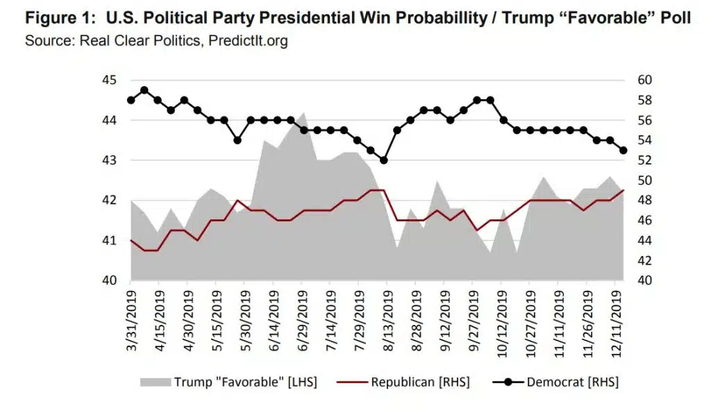 We believe the equity market rally we have witnessed since the U.S. 2016 election (S&P 500 Index up 57.2%) has been due in part to capitalist influences. The rally we have seen in Q4 2019, we believe, has been driven, again in part, by a reduction in expectations President Trump will be removed from office and thus will be free to stand in the 2020 election. In our view, markets may have already nodded to a material probability that Trump could win another election. Alternatively, a 180-degree shift in policy (favoring progressivism via a Democratic president), may prompt some giveback in the capitalist premium priced into the market today.
