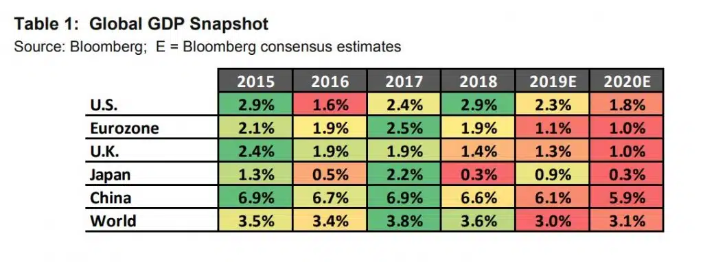 Global economic growth should continue to decelerate, although the support of central banks and an opportunity for a modest manufacturing recovery should offset recession risk.