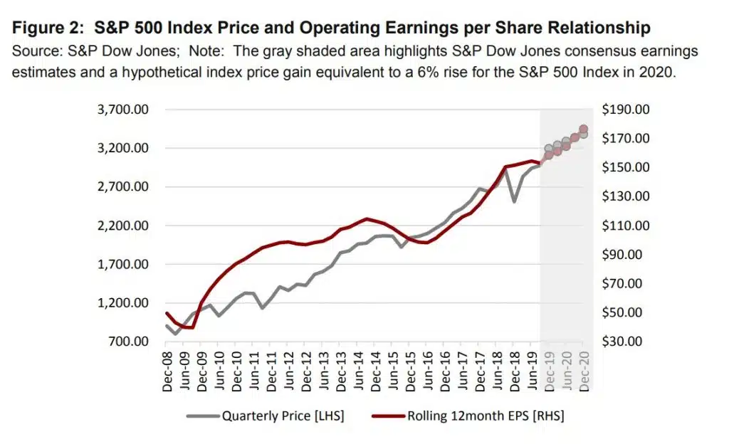 The gray shaded area highlights S&P Dow Jones consensus earnings estimates and a hypothetical index price gain equivalent to a 6% rise (our forecast) for the S&P 500 Index in 2020. Price gain measured as of the index price on 12/17/2019.