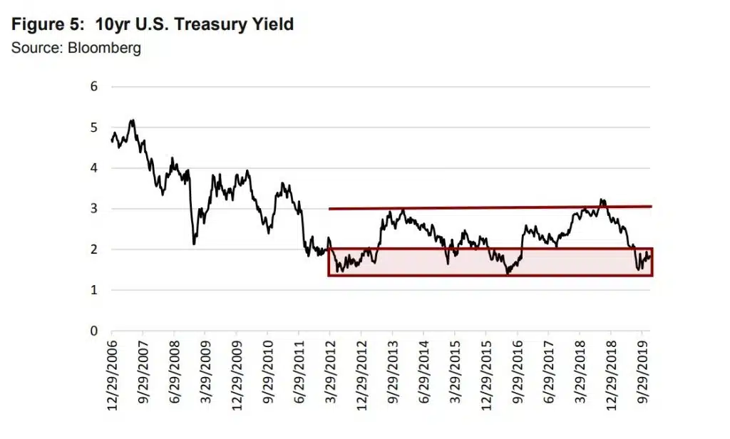 In our view, the 10yr yield could stay largely within established ranges. The shaded range (1.35% - 2%) may be the most significant. While we could see the yield float above 2% for a period, we believe there is a substantive probability that new lows are attained over the longer term.