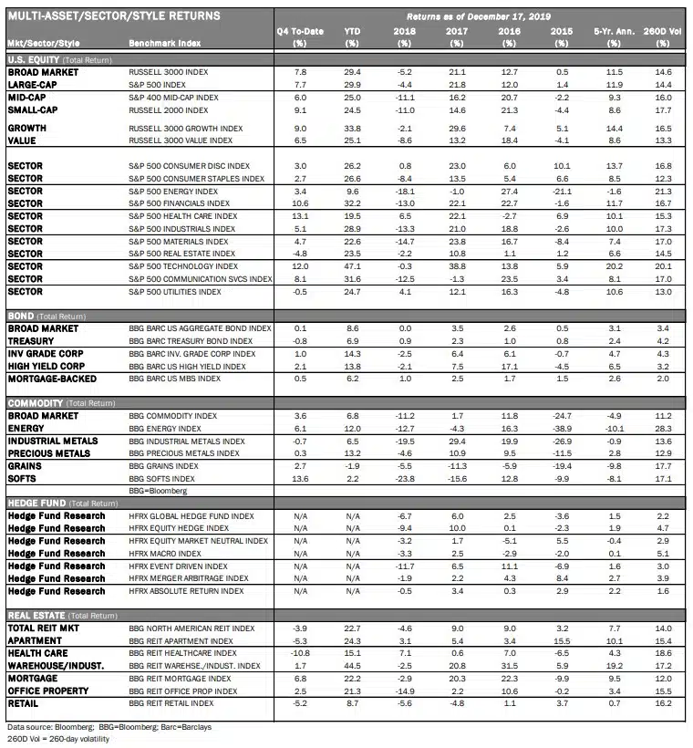 Not that the job of capital market forecasting and portfolio management is easy by any stretch, but 2020 sets up as an environment that is the most difficult to call of any in recent memory. In a typical year, the necessary forecasting recipe should be economic fundamentals, earnings, monetary policy, and a dose of market sentiment. The new year requires all of that and perhaps a political prediction acumen that frankly few possess. Coupling the normal political prognostication difficulty with the unprecedented, bifurcated nature of the U.S. election landscape and you get a jungle of varied, potential outcomes. Despite the additional complexity, we have the job of guiding investors on what we believe is the best way to think about capital allocation in 2020. That indeed is what we will do.