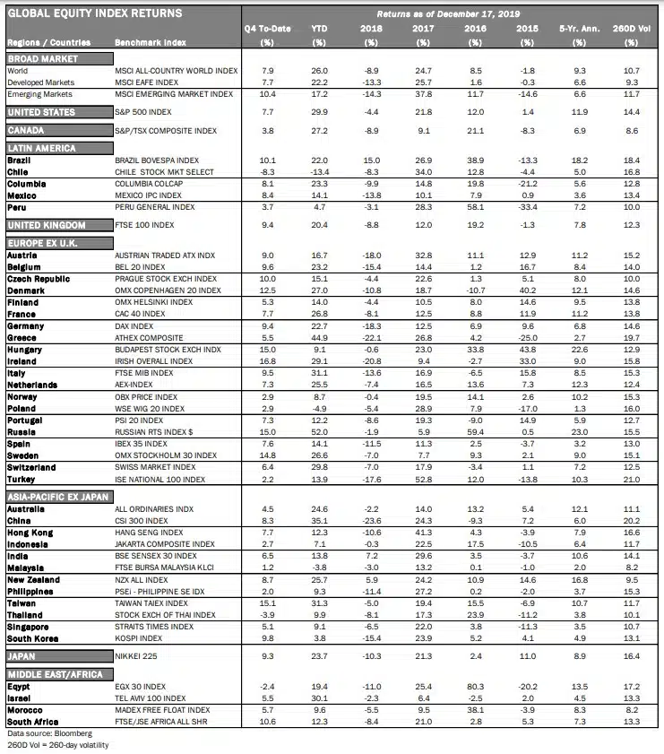 We are anticipating equity markets to post modest gains in 2020, driven by monetary policy support and slight earnings gains. Valuations are not as compelling as they were a year ago