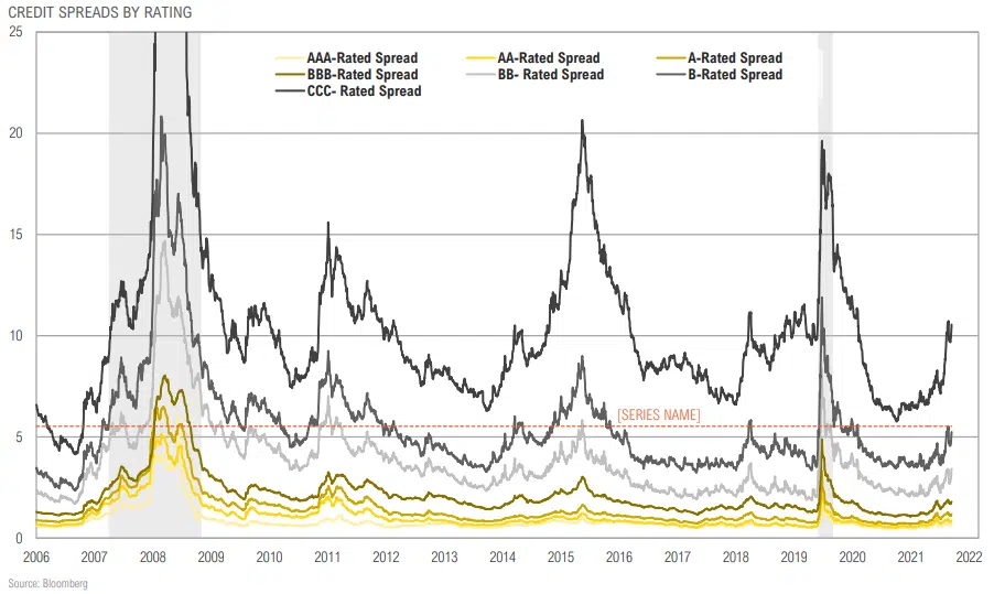Credit spreads spiked post May inflation surprise; notably, CCC-rated bonds have widened 377 bps since the start of the year