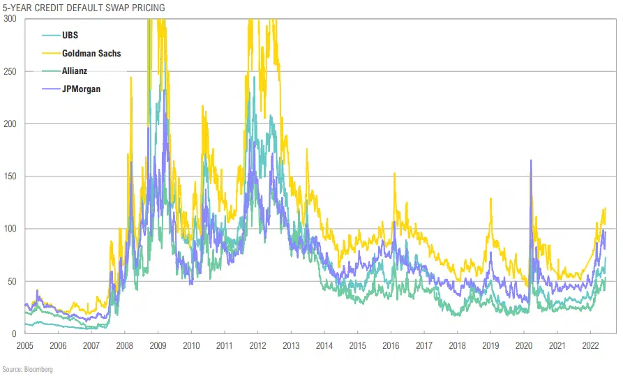 Perceived credit risk of large asset managers is trending higher and hit a 2-year high on growing fears that Fed may tip the US into recession