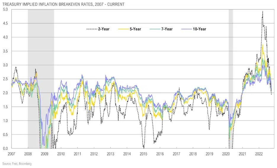 Intermediate-term inflation expectations have eased after breaking out to multi-decade highs; 2-year inflation breakeven is below 2% for the first time since 2020
