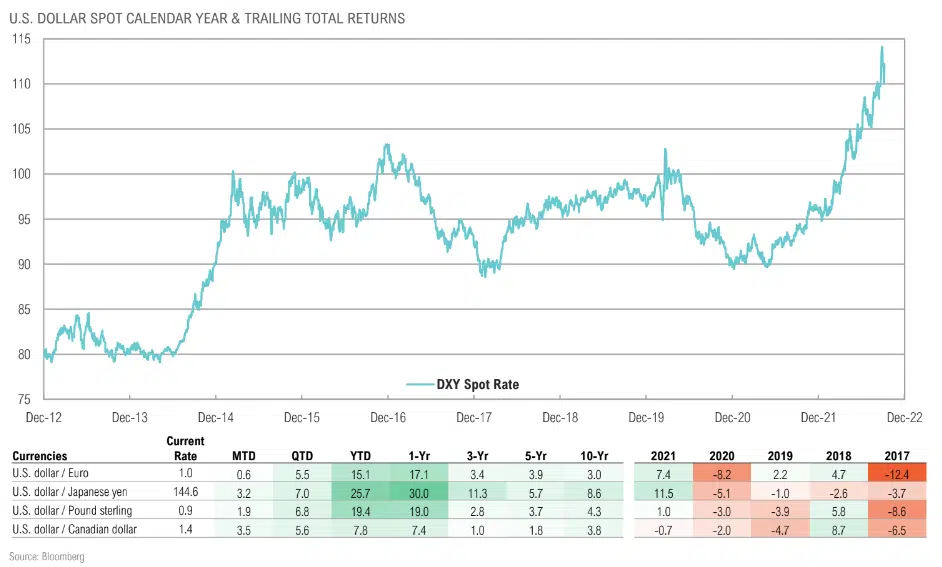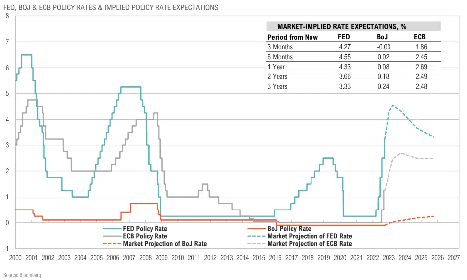 Relative rate expectation differences of U.S. vs. Europe and Japan are still dramatic, supporting the U.S. dollar; 1H23 U.S. rate cuts no longer priced in