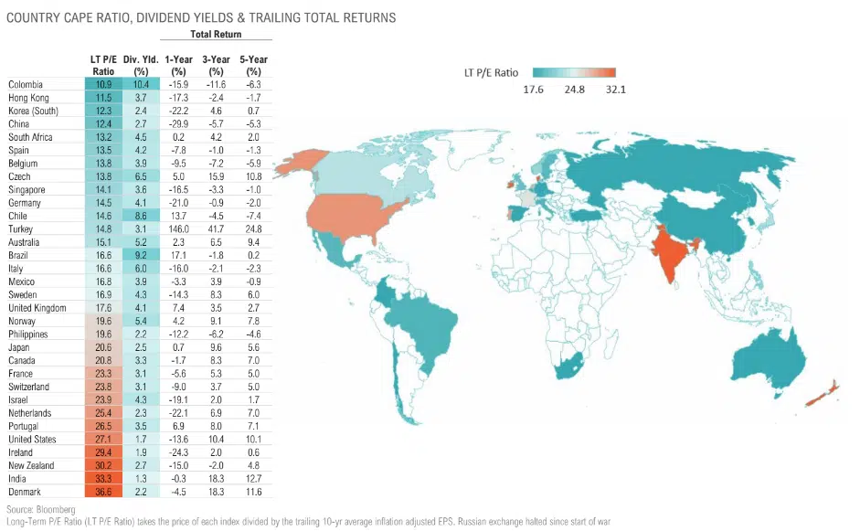Cyclically-adjusted P/E (CAPE) multiples by country; >5% yields in Colombia, Brazil, Chile, Norway, Australia and Italy; Russian markets remain effectively closed for offshore investors