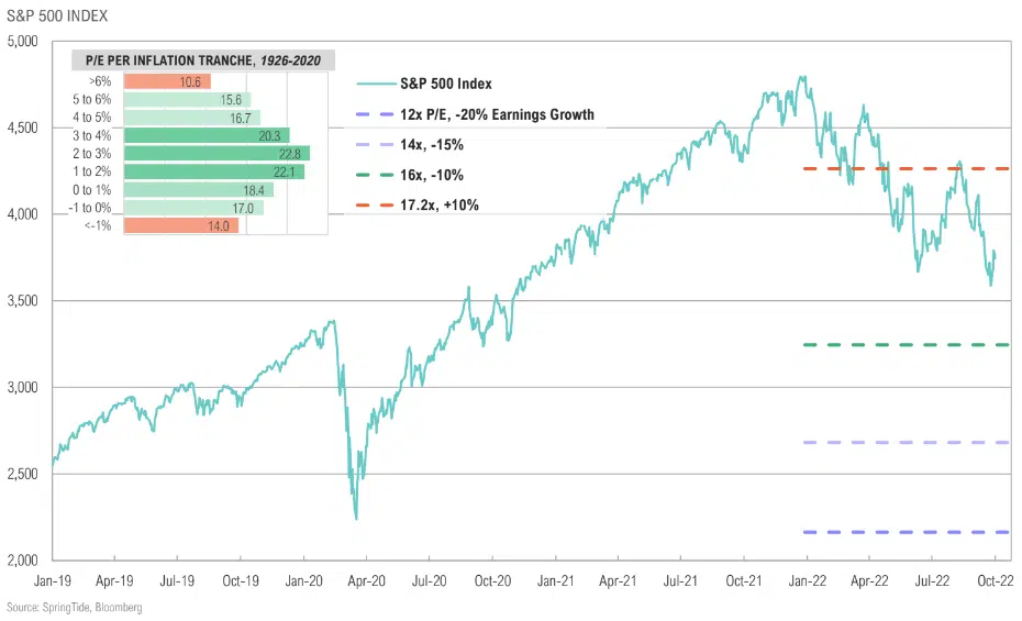 What if inflation doesn’t roll and stay lower? How low can we go? P/Es to consider are 16x, 14x, and 12x, applied to various levels of earnings decline