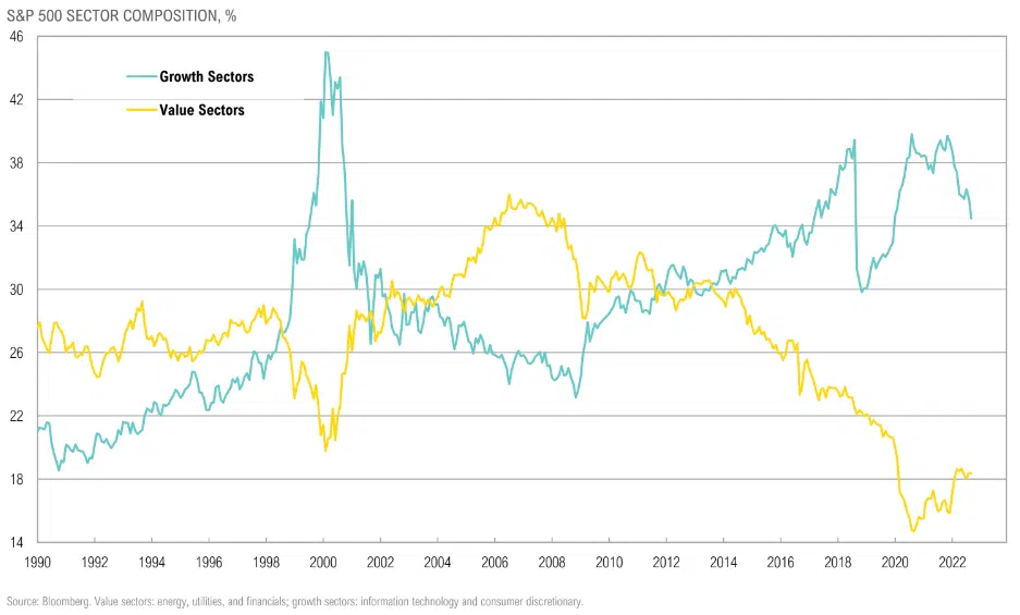 Still a long way to go? The weight of technology and consumer discretionary stocks in the S&P 500 has dropped to 34.5% but still near historic highs