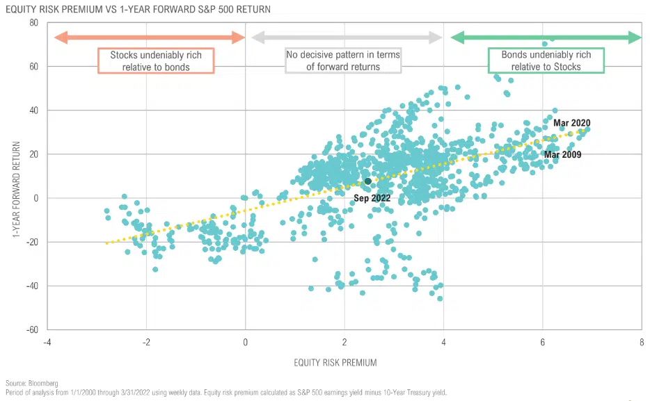 A loose correlation exists between the S&P 500 equity risk premium (ERP) and 1-year forward returns; ERP currently at a middling 2.4%