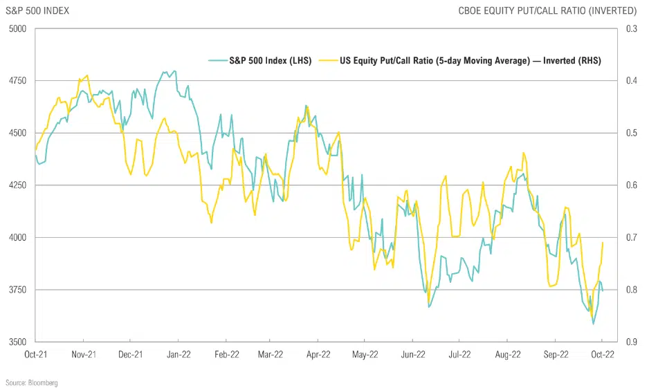 Equity put/call ratio has a strong inverse correlation to equity returns; current showing significant bearish positioning