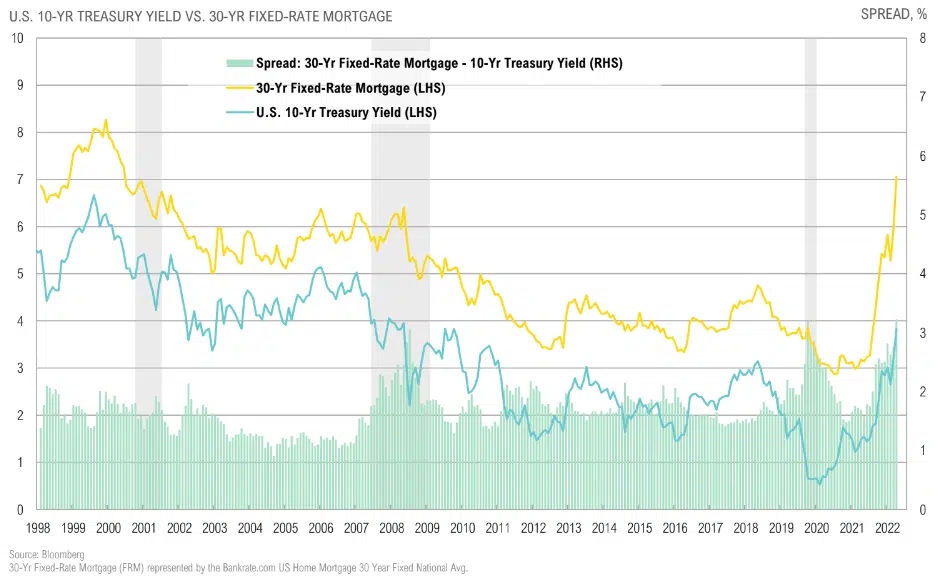 30-year fixed mortgage rates spiked in September as mortgage rate spreads vs. 10-year Treasury widened; higher rates will have a negative impact on housing and consumers with a lag
