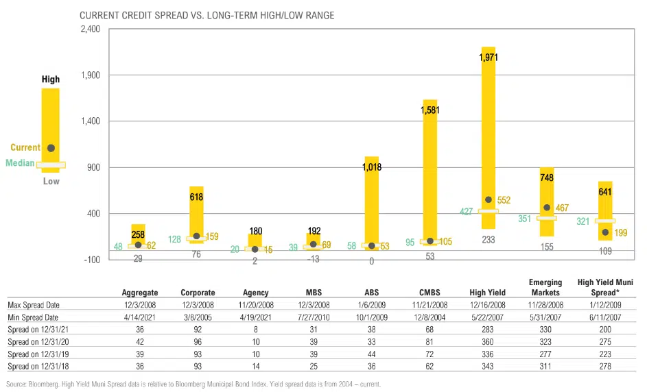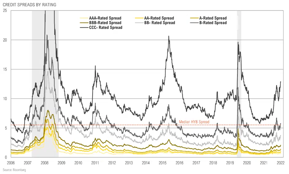 Credit spreads at or modestly above average across most sectors; starting to shift up modestly as recession fears start to become more entrenched