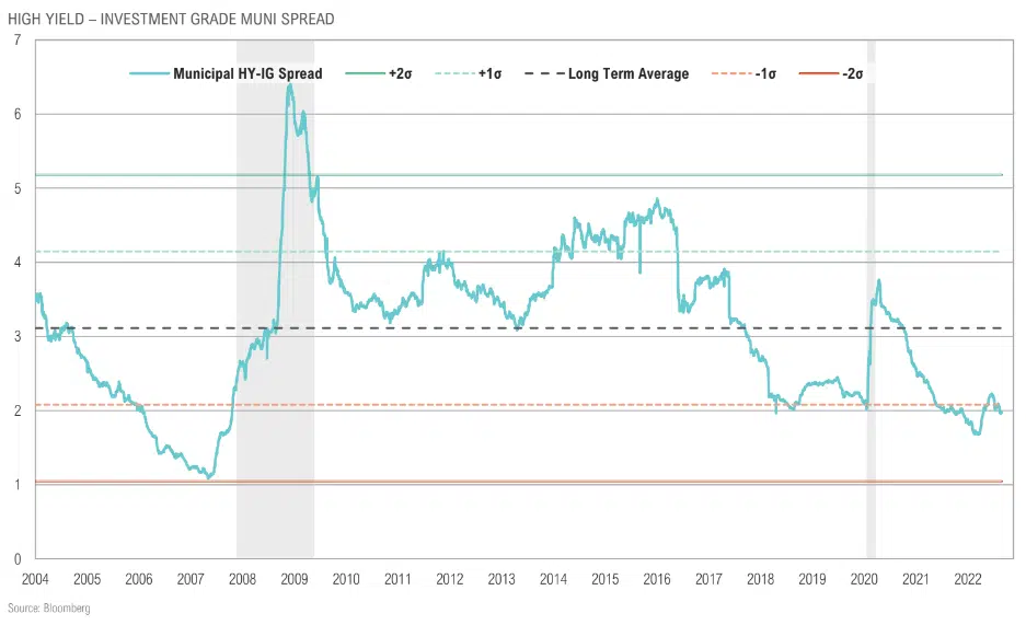 High yield-to-investment grade muni spreads have widened from 2022 lows but remain tight relative to history