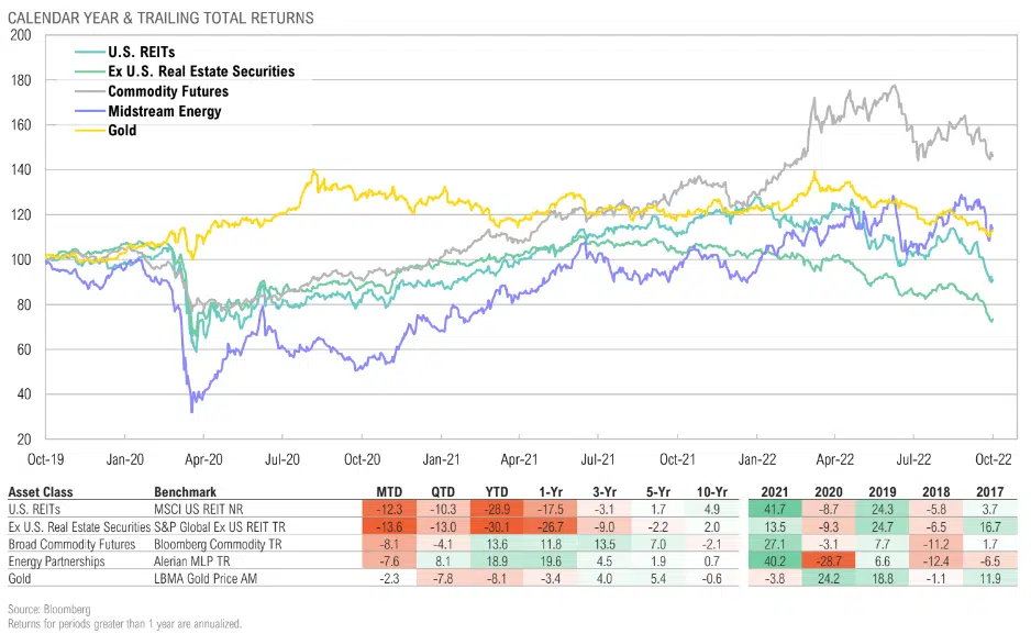 While energy gave back returns in September, it was the only area of the real assets and infrastructure category to be up in Q3; REITs continue to struggle in the rising rate environment
