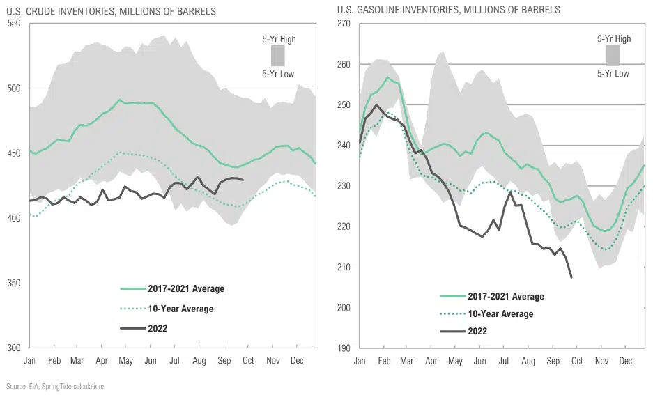 Crude oil and gasoline inventories remain well below long-term averages, despite nearly 180 million barrels being released from U.S. SPRs YTD