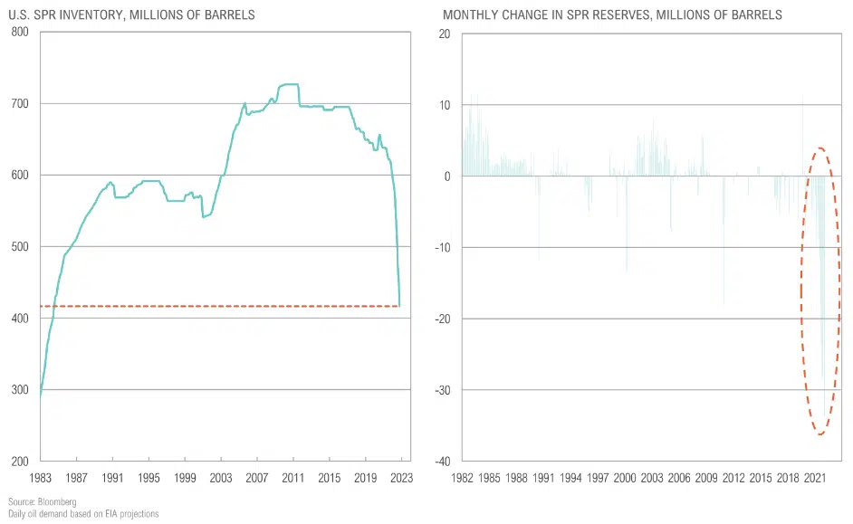 U.S. strategic petroleum reserves have been depleted to the lowest level since 1985; 180mn barrels depleted, 417mn remaining = 21 days of avg consumption