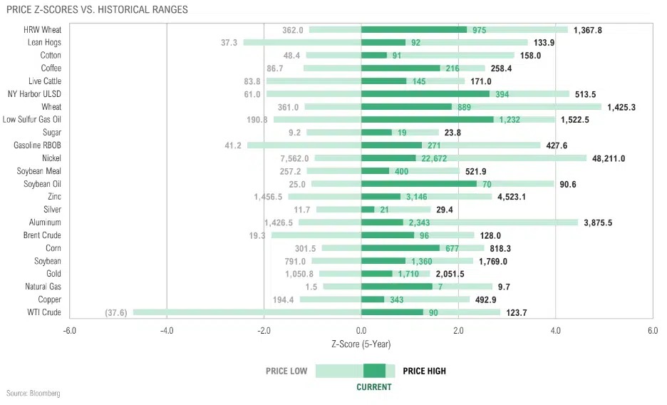 Several commodities hit new all-time highs following Russia’s invasion of Ukraine given their importance to global supply of energy and food; recent correction is modest in context
