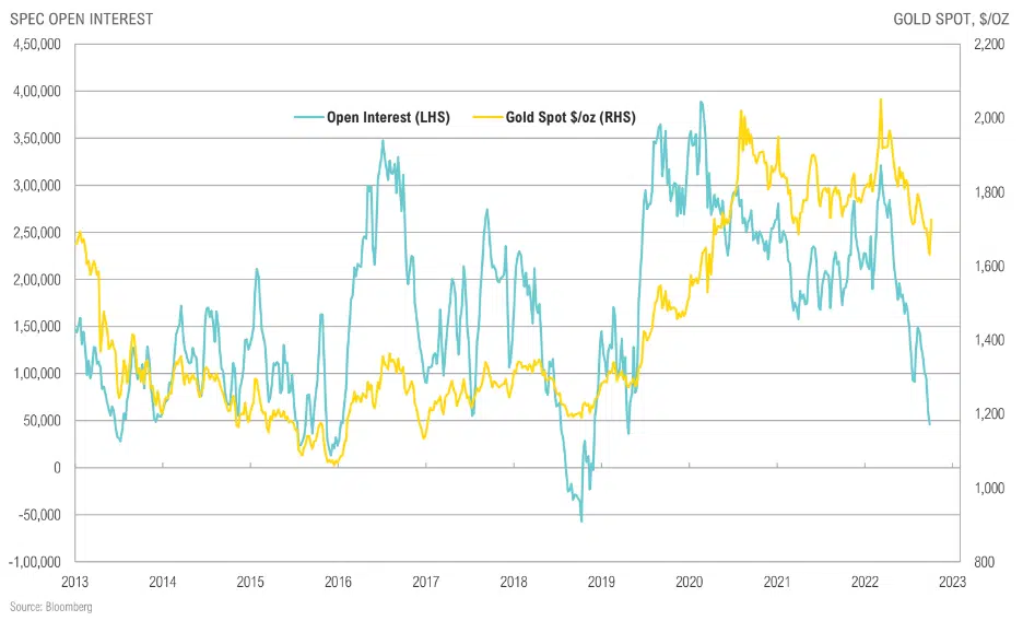 Spec positioning in gold futures suggests markets are nearing capitulation, which has generally resulted in above-average forward returns