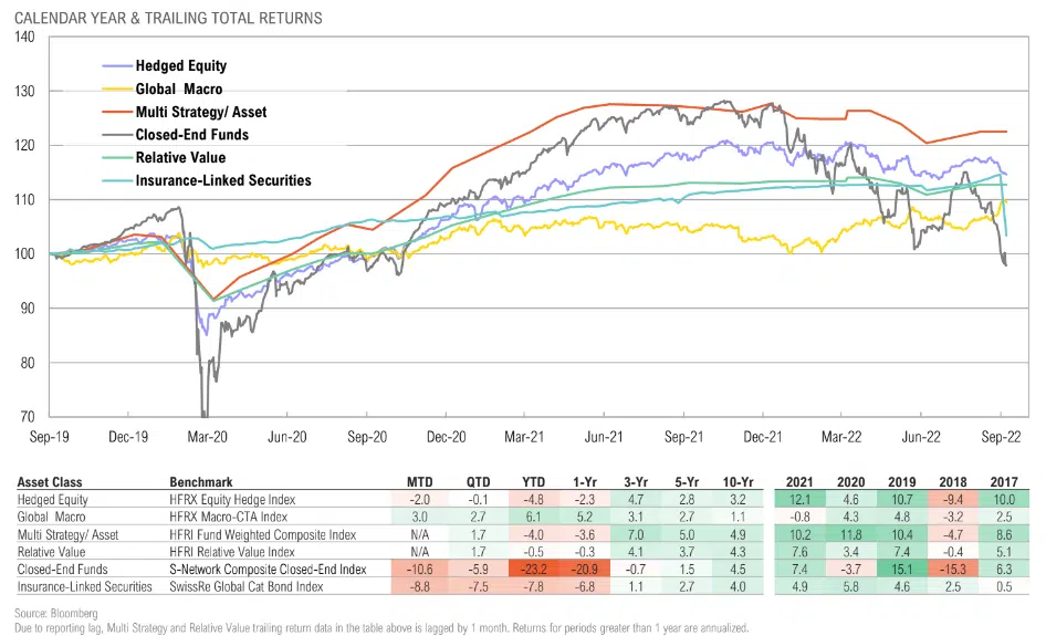 Insurance-linked securities was the worst performing opportunistic asset class in Q3 as hurricane Ian threatens heavy losses; global macro is the only positive asset class YTD