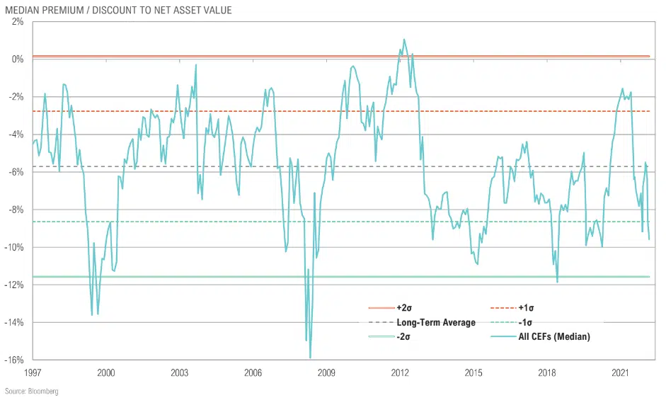 CEF discounts have widened significantly from -6.4% in August to -9.6% in September; U.S. taxable bonds are trading at widest discount since 2018