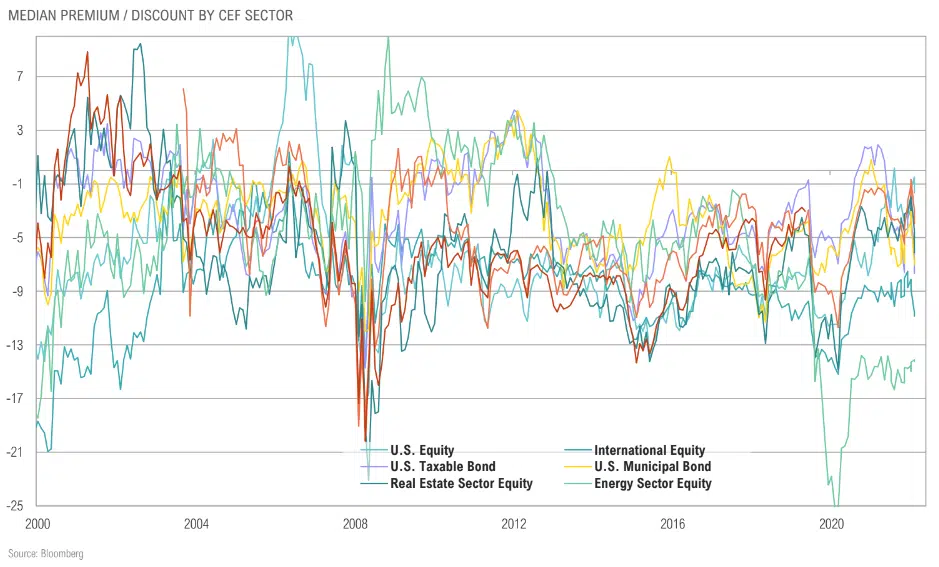 CEF discounts mixed by sector but are broadly widening; U.S. taxable bond CEFs are trading at widest discount since 2018