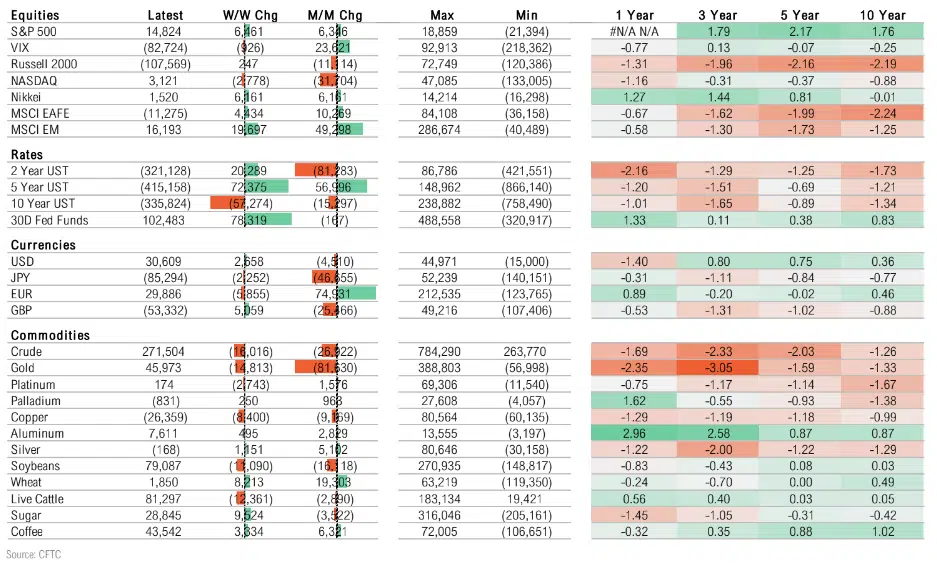Futures spec positioning shows bearish positioning in U.S. intermediate term bonds, gold, crude and several stock indices