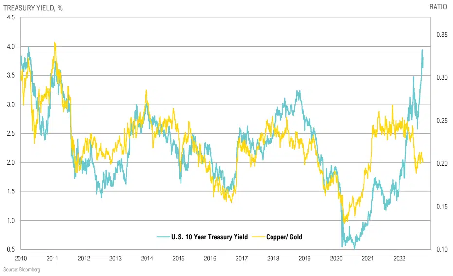 Copper/gold ratio rolling over suggests growth slowing and longer-term interest rates may follow suit