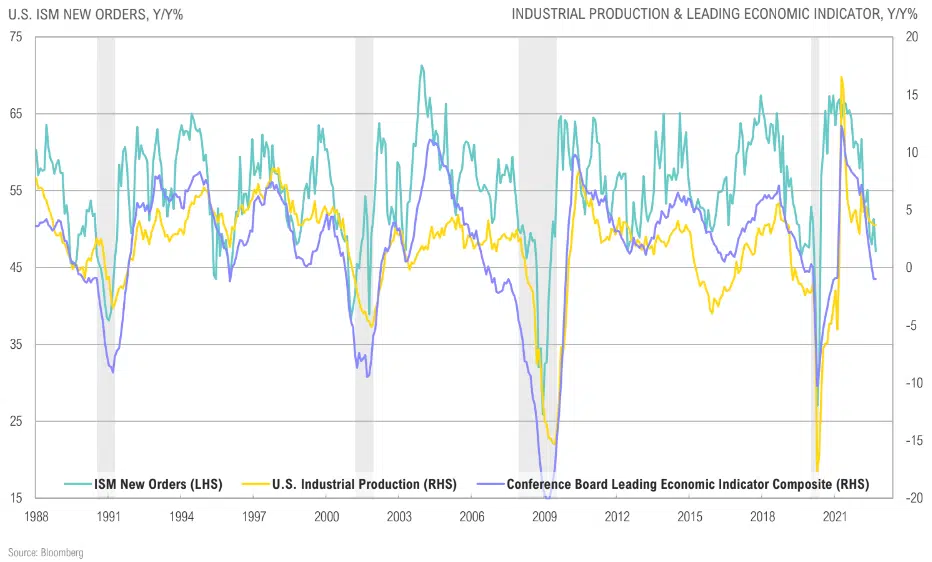 Industrial production and leading indicator growth peaked a year ago, have been slowing since; forward-looking indicators continue to trend lower