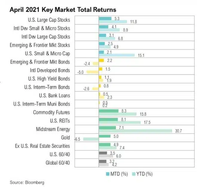 Risky assets grinded higher in April as they digested one of the best 12-month periods in history. At the end of the month, most asset classes were sporting year-to-date returns that would be considered attractive for an entire year. The broad-based nature of the April returns, extending even to bonds, seems due to policymakers’ continued, extraordinary monetary and fiscal support.