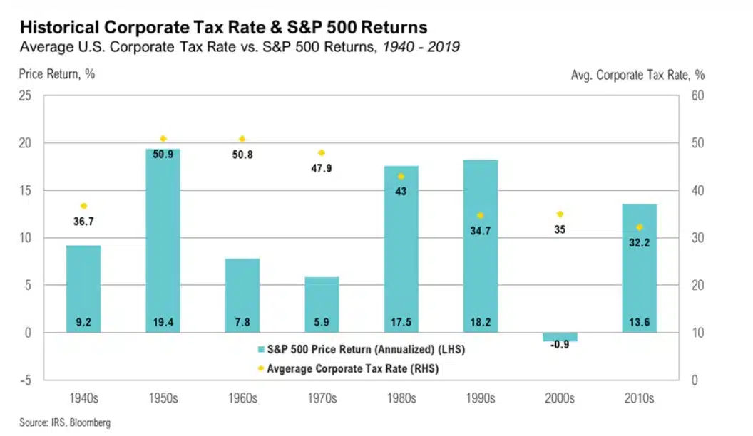 Biden’s tax plan also proposed several changes to corporate tax rates, the most significant being an increase in the corporate tax rate from 21% to 28%. Here, too, historical data show little relationship between the corporate tax rate and stock market returns.5,9