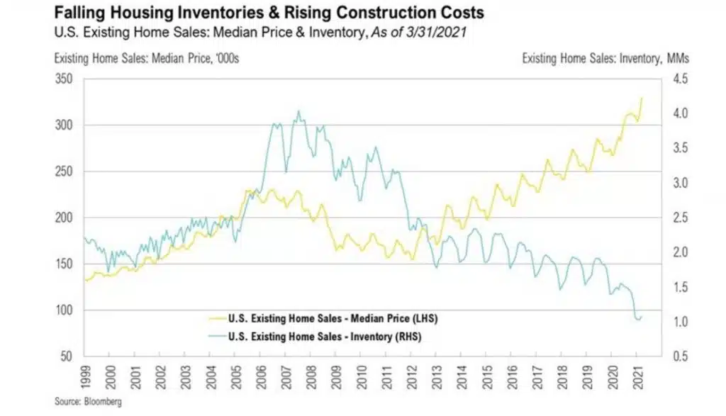 Few comparisons are as extreme—and evident to the average American—as the rise in lumber prices. Lumber, the generic term used to refer to a random length lumber futures contract (110 board feet in 2 inch by 4 inch pieces of varying lengths,6 has been squeezed by both increases in demand as well as severe supply disruptions. On the demand front, there’s the perfect storm of the mass migration out of cities into single family homes in lower density areas, combined with low interest rates and unusually strong personal incomes. On the supply side, lumber mills have been running at reduced capacity due to the pandemic, and they are struggling to keep up.7 Adding insult to injury, a pine-eating beetle has infested British Columbia, Canada, and shaved 5-7% off total U.S. lumber supply.8 The extreme dynamics in lumber are also impacting the housing market. Median home prices have increased by almost 20% in the U.S. while the inventory of homes for sale has hit an all-time low.9