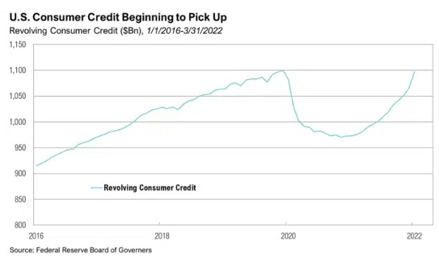 Persistent inflation can also prevent consumers from investing, especially when it exceeds wage growth. Over the past 12 months, wage growth has been 4.6% – a full 3.7% lower than inflation.4,5 The inability of wages to keep pace with inflation is showing up in revolving credit balances, which jumped 12.8% in March on a year-over-year basis, the largest increase since April 2001.6 While the absolute levels of consumer credit are not yet concerning, the rapid rate of change speaks to U.S. consumers’ precarious situation. The personal savings rate over the past year tells a similar story. In March 2022, it hit 6.2%, substantially lower than the stimulus-fueled 26.6% logged in March 2021 and a material deterioration from the December 2021 reading of 8.4%. The current reading is the lowest savings rate since December 2013.7