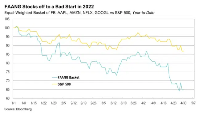 The disappointing earnings season for the FAANG stocks resulted in their weight in the S&P 500 dropping from 17% on March 31 to 15% at the end of April, and they cumulatively contributed -2.7% to the S&P 500’s -8.7% return in April.