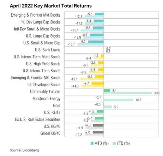 April marked the worst month for the S&P 500 since the onset of the pandemic in March 2020 as the index fell 8.7%. Small caps did even worse, falling 9.9% as measured by the Russell 2000 Index. From a style perspective, value stocks, measured by the Russell 1000 Value Index, outperformed the Russell 1000 Growth Index, dropping 5.7% (versus 12.1%). The 6.4% of outperformance by value stocks over growth stocks marked the largest spread between the two indexes since March 2001, when markets were in the process of unwinding the excesses of the dot-com bubble. From a sector perspective, consumer staples were the only sector with positive returns, up 2.5% over the month as investors fled to names with more stable earnings and dividends. Energy was the second best performing sector, down just 1.5%. Historically higher growth sectors were punished over the month, including communication services (-14.1%), consumer discretionary (-11.9%), and technology (-10.9%), all down double digits.
