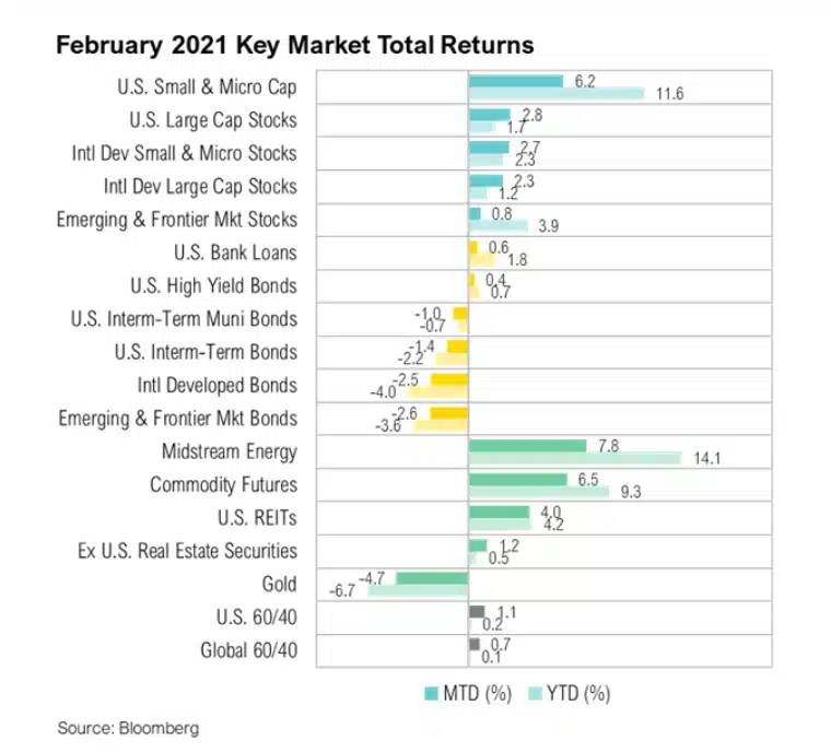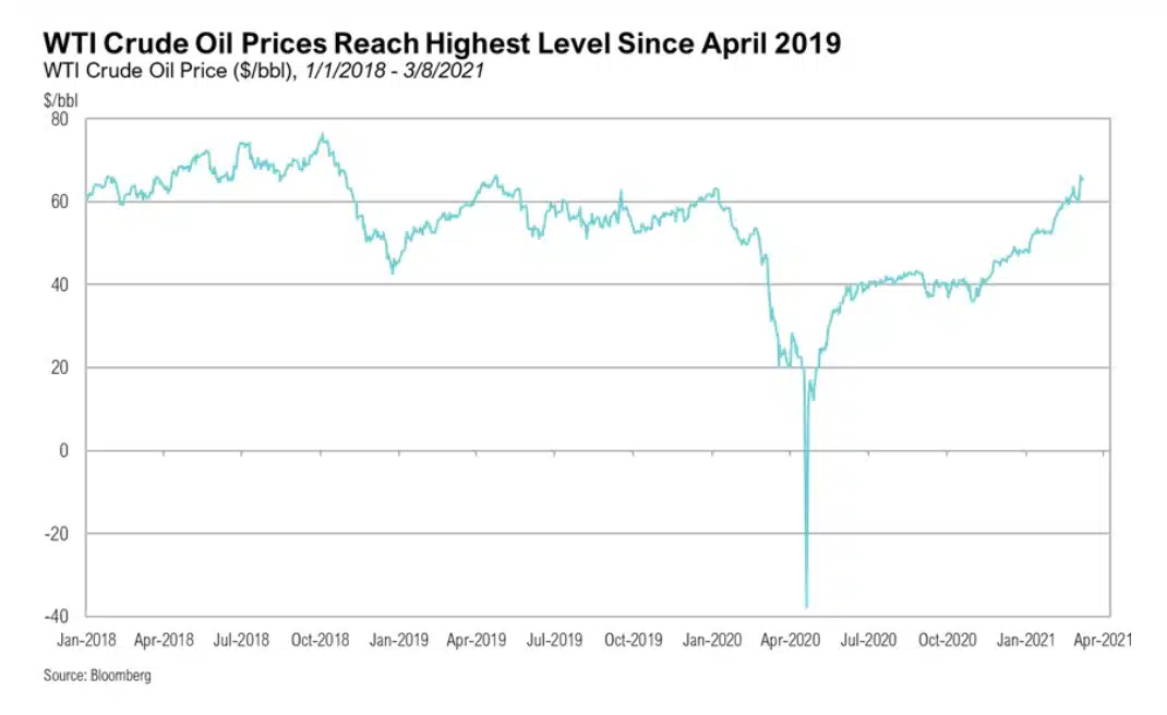Crude oil closed above $66/barrel on Friday for the first time since April 2019. The rally continued last week after OPEC+ talks unexpectedly announced that there would be no increase in oil production through April 2021.5 In addition, outlooks were also bolstered by President Biden’s announcement that the U.S. expects to have enough doses to vaccinate the entire adult population by the end of May.6 At the same time, U.S. oil production has come offline given the treacherous February weather. The U.S. Energy Information Administration said production was less than 10 million barrels per day in the last two weeks of February, a rate last seen in early 2018.7 These developments all point to a sustained rebound in oil prices.