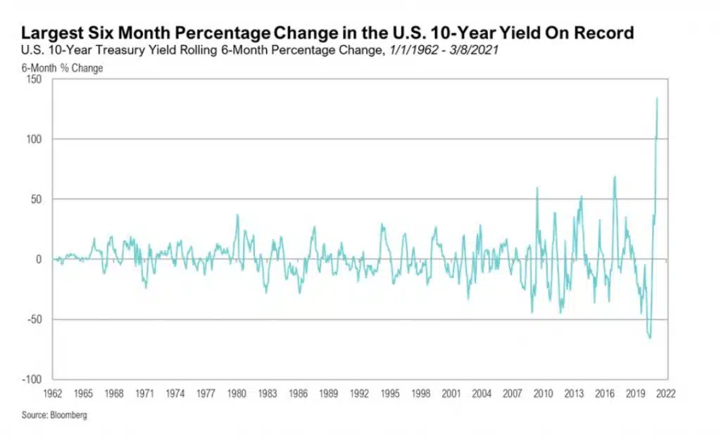 Perhaps no other measure chronicles the market’s decline and recovery during the COVID-19 era more succinctly than long-term interest rates. The 10-year Treasury declined to an all-time low of 0.4% on March 9, 2020. As of March 8, 2021, this widely quoted barometer of economic growth and inflation sat at 1.59%. While the move seems insignificant in absolute terms, the relative increase is one of the most drastic in history. Even more surprisingly, it comes on the heels of its largest ever six-month percentage decrease leading up to March 2020.