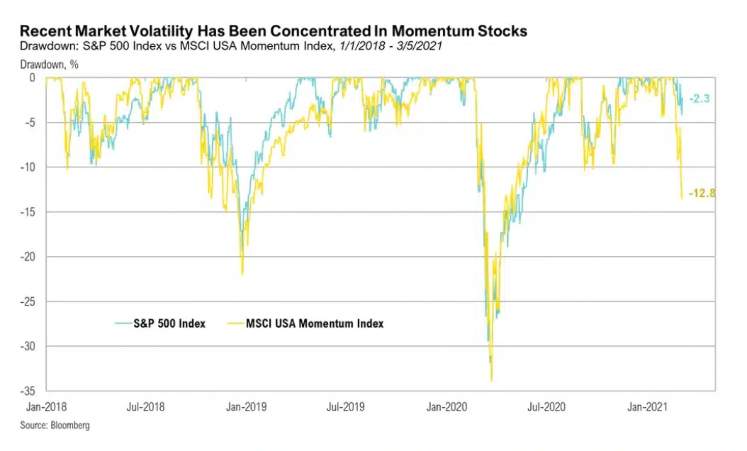 The recent spike in interest rates has taken the wind out of growth investors’ sails. This is best captured by the -12.8% decline of the MSCI USA Momentum Index, relative to the – 2.3% performance of the S&P 500 Index over the week ending March 5. The Federal Reserve, however, is likely not too bothered by the recent rise in interest rates because stocks are within 5% of their all-time highs and the federal government is on the verge of passing a $1.9 trillion spending bill. However, we believe the Fed will need to take further accommodative action if interest rates rise much further—and will be especially likely to do so if broader equity markets collapse, as well.