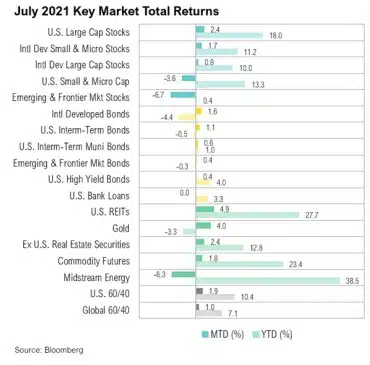 During July, fears of impending inflation declined, sparking a positive response in yield-sensitive assets and mixed results in other markets.