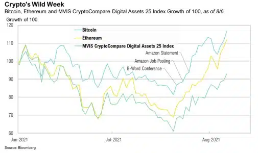 Digital assets performed exceptionally well in July. The rally started on July 20 in anticipation of the “The BWord” Bitcoin conference which included keynote speakers such as Tesla CEO Elon Musk, Twitter CEO Jack Dorsey, and ARK Invest founder Cathie Wood.