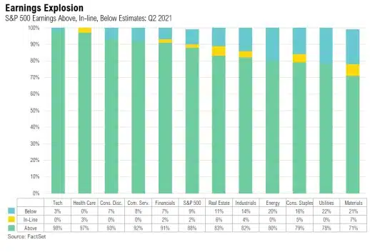 By the end of July, 59% of the companies in the S&P 500 had reported earnings for the second quarter, and results were overwhelmingly positive. According to FactSet, companies in the S&P 500 Index reported their highest year-over-year earnings growth since the fourth quarter of 2009, during the global financial crisis recovery.8 Although the size of this earnings growth is heavily influenced by the lower earnings base set during the coronavirus crisis a year ago, the breadth and magnitude of earnings surprises demonstrate how impressive the economic snapback has been. Of the companies that have reported, 88% reported earnings that exceeded expectations—a considerable step up from the five-year average of 75%. If these kinds of results continue throughout this earnings season, it will mark the highest percentage of positive surprises in an earnings season since FactSet started tracking this data in 2008. The magnitude of positive earnings is as remarkable as the breadth, too. In aggregate, companies in the S&P 500 are beating estimates by 17.2%, almost 10% higher than the five-year average of 7.8%. The updated expected second-quarter earnings growth rate is a staggering 85.1%, up from an expected 63.1% just one short month ago. This again is the highest year-overyear earnings growth since 2009. The chart below shows the break-out by sector of earnings above, in-line, and below expectations.