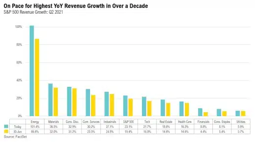 The sectors with the highest percentage of earnings surprises have been technology, health care, consumer discretionary, and communication services—mostly asset-light, growth-oriented sectors. That said, all 11 sectors reported year-over-year earnings growth, and the sectors that were hardest hit a year ago—energy, industrials, and consumer discretionary—have led the recovery. At the individual company level, the biggest earnings surprises for the quarter belonged to Valero Energy, Twitter, V.F. Corporation, PNC Financial Services, and Hasbro; all of them more than doubled analyst estimates.8 From a revenue perspective, 88% of S&P 500 companies reported revenues above estimates, also crushing the five-year average of 65%. In absolute terms, year-over-year revenue growth for the index is now projected to be 23.1%, which would be the highest since FactSet started publishing this data back in 2008.8