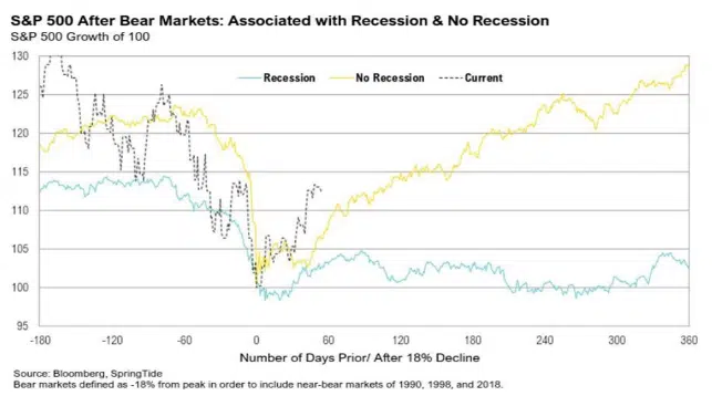 Recessions matter for a number of reasons, not least of which is their impact on corporate earnings and stock prices. Currently, markets are sitting at a fork in the road, which might be best assessed by examining previous bear markets—comparing those that werenot associated with recessions to ones that were. The results are presented in the chart below. Recessions have historically caused two very different outcomes for the stock market. If, according to the ticker tape of history, the U.S. economy can skirt a recession, dips like the one this year should be bought. If, however, we enter recession, earnings will likely suffer, and more volatility may behead.