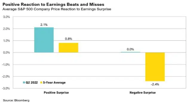 Despite relatively lackluster results overall, investors have reacted positively to earnings news, which clearly indicates that expectations were overly negative heading into reporting season. The average two-day price change in response to an earnings surprise for S&P 500 constituents was +2.1%, much higher than the 5-year average of +0.8%.10 Netflix, for example, beat earnings estimates by 8.8% despite reporting a loss of nearly one million subscribers, the largest decline in its history.11 The stock rose 7.3% in response suggesting even worse news had been expected and priced in. Co-CEO Reed Hastings summed it up best by describing their results as “less bad.”11