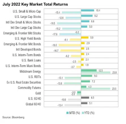 The S&P 500 jumped 9.2% higher in July, representing the best monthly return for the index since November 2020. From a style perspective, growth stocks outperformed value stocks, as the Russell 1000 Growth Index gained 12.0% while the Russell 1000 Value Index rose 6.6%. Small cap stocks slightly beat large cap stocks, returning 10.4% as proxied by the Russell 2000 Index. Midstream energy was one of the top performers over the month, returning 12.5%. Year-to-date, the industry has returned 23.8%, outperforming the S&P 500 by 36.4%. Despite relatively good performance by other real assets, gold disappointed over the month, falling 3.0%
