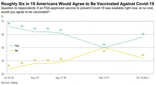 Even amid surging new case numbers and hospitalization data, positive developments have emerged in terms of the pandemic. On November 9, Pfizer and BioNTech announced promising early results from a phase three study of their vaccine candidate, BNT162b2. The initial data suggested the vaccine was 90% effective in reducing COVID19 cases.8 A week later, Moderna announced similarly hopeful results. From a sample of 30,000 study participants, 185 in the placebo group contracted COVID-19, compared to 11 in the group that received the vaccine. Perhaps even more encouraging, none of the vaccinated candidates developed a serious case of COVID-19.9 Two days later, on November 18, Pfizer announced that its vaccine might be even more effective than early results indicated. Of the 44,000 people enrolled in the study, a total of 170 confirmed cases of COVID-19 were evaluated. Of those, just eight came from the vaccinated group, implying an effectiveness of around 95%.10 There are at least two other positive developments. The first is that the number of Americans who are willing to take the vaccine is increasing. According to Gallup data gathered from October 19 to November 1, 58% of Americans would take an FDA-approved vaccine if it were readily available, up from 50% in September.11 Second, distribution of these vaccines has already begun ahead of the expected FDA Emergency Use Approval (EUA) with as many as 40 million expected to be shipped nationally.12