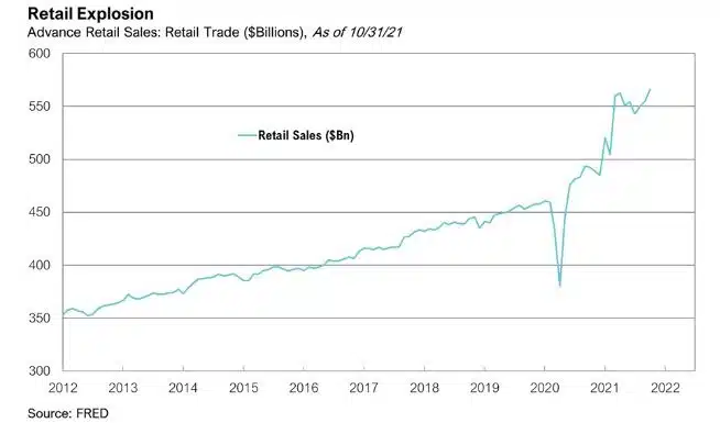 Excess savings, online spending, early holiday demand, and inflation all contributed to a spending frenzy as retail sales rose by a seasonally adjusted 1.9% in October, bringing the cumulative total to its highest on record.